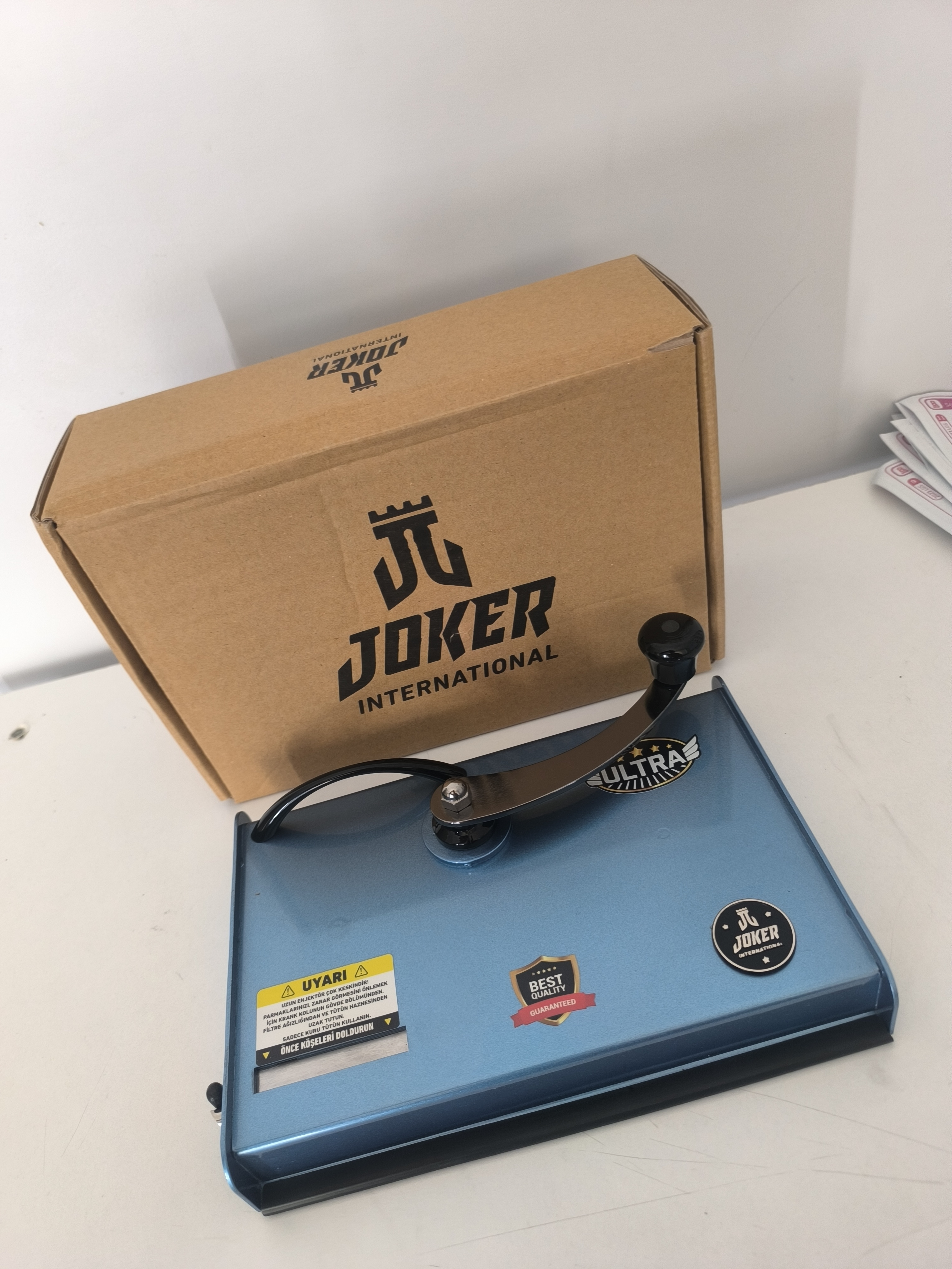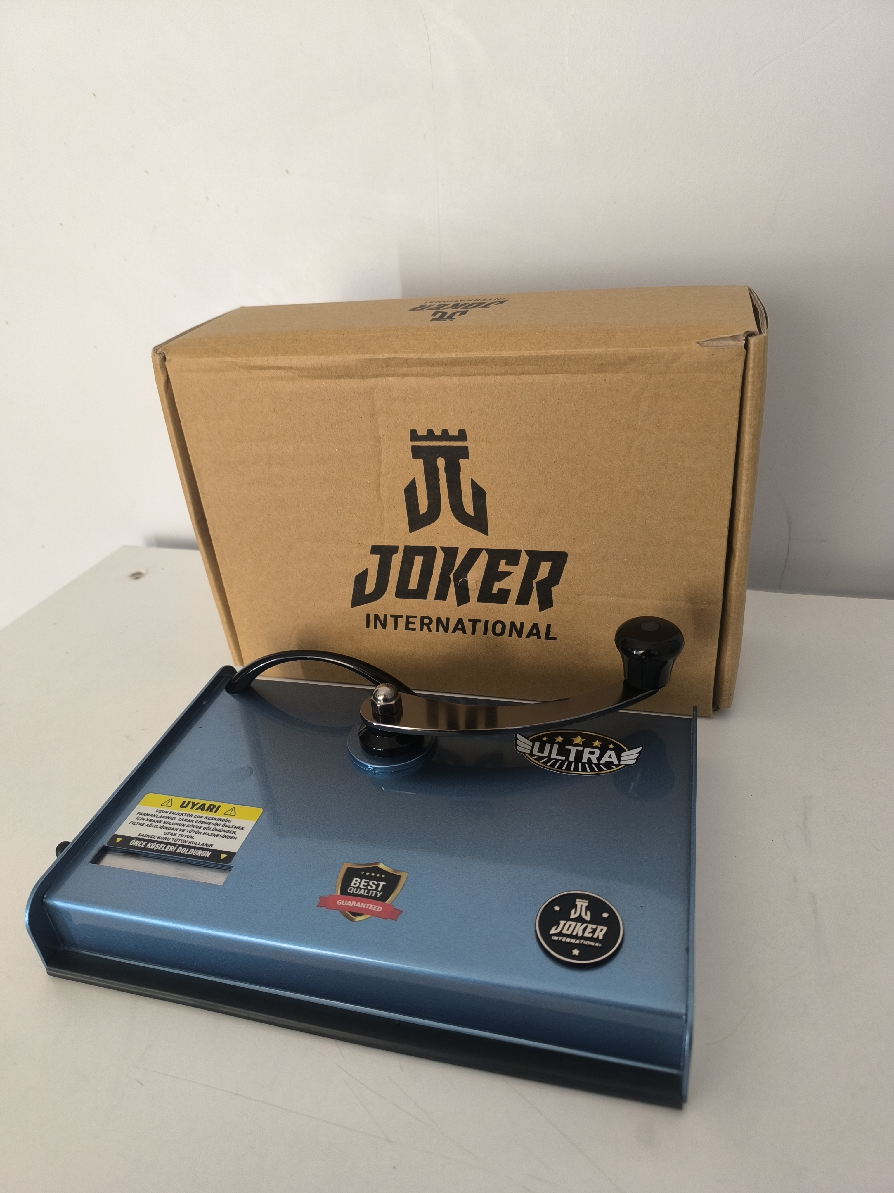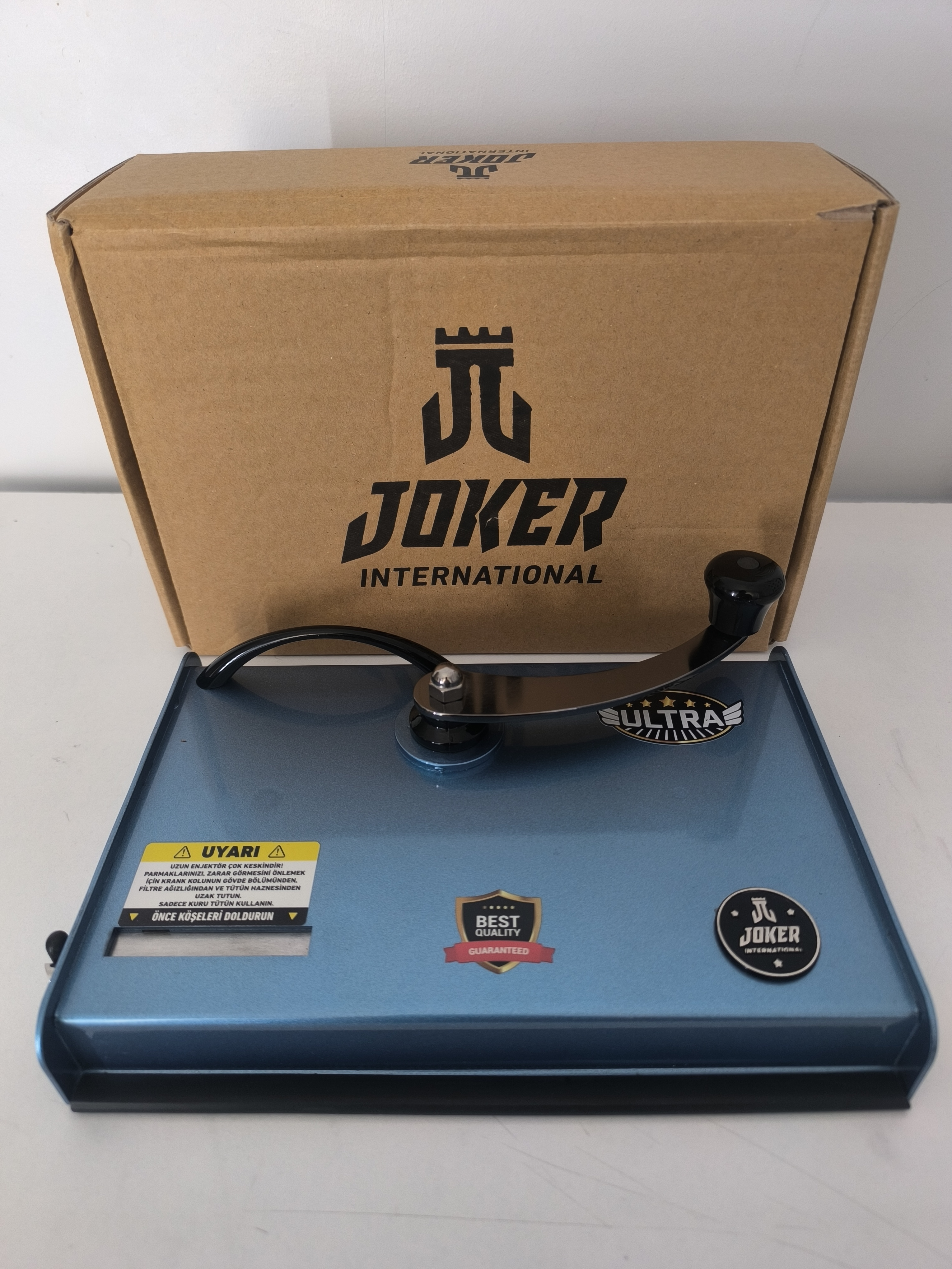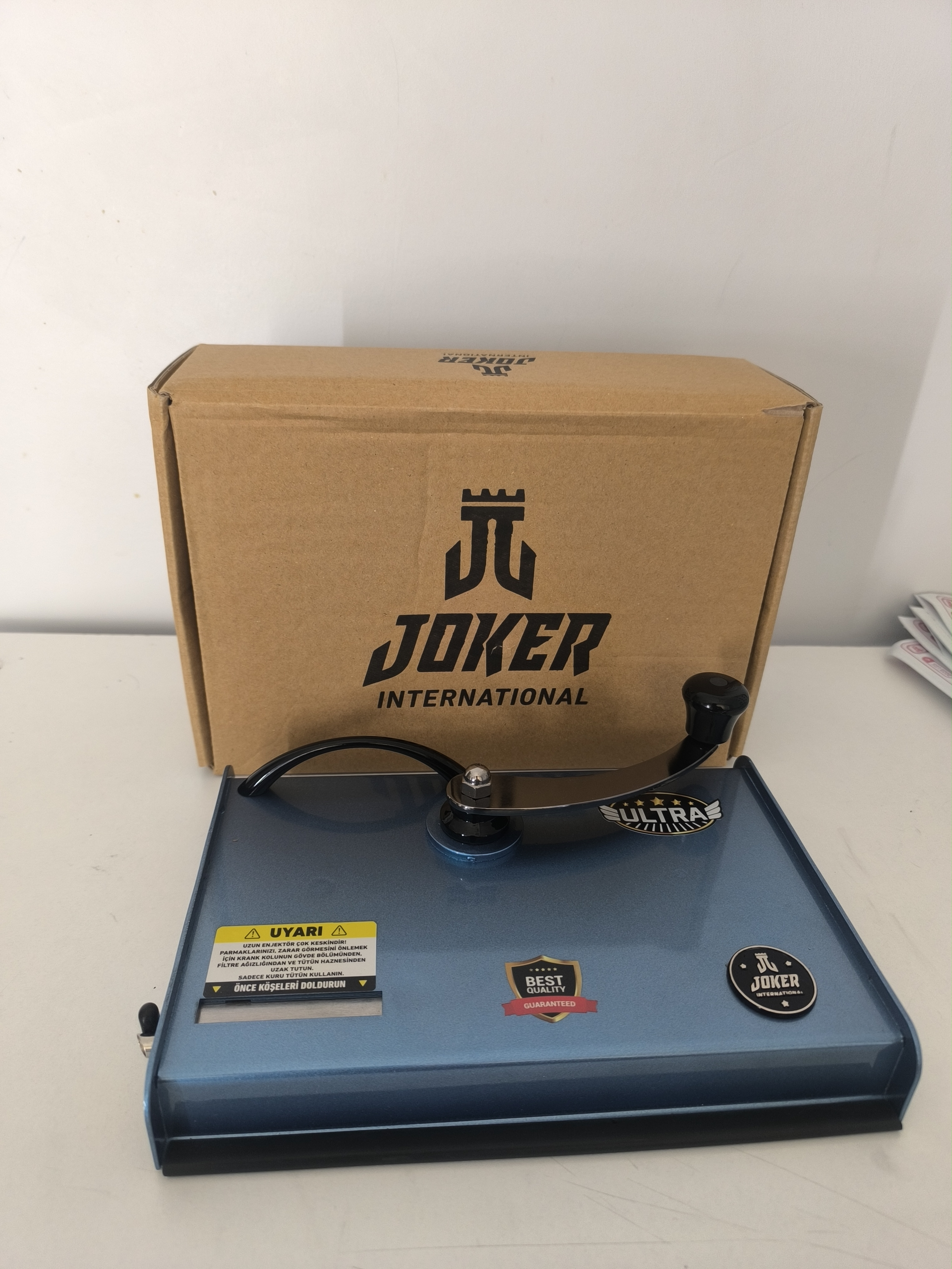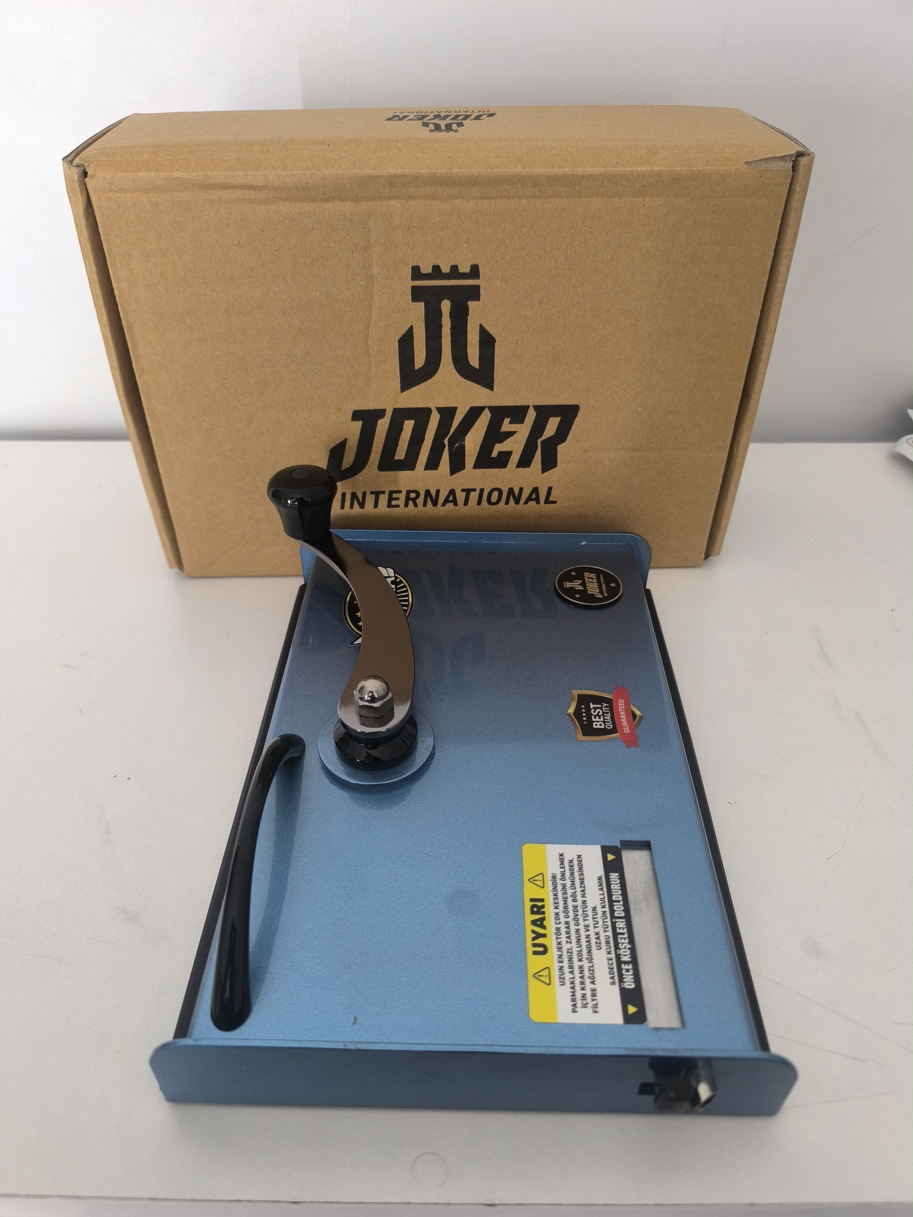 JOKER ( kalın sarım ) kollu makina * JOKER (kalın sarım ) kollu sigara sarma makinesi, eski makinelerine kıyasen çok daha iyi dolum kalitesine sahip, kullanım şekli daha kolay, tasarımı daha ergonomik yapıya sahiptir. *Tütün dolum kalitesi eski versiyonları ile kıyaslanamayacak kadar düzgündür. Tütünü tam presleyerek makarona doldurduğundan, dolum esnasında kola oldukça rahatlık gelmiştir. *Zorlanmadan kolu çevirebilirsiniz. Kalın makaron ölçüsünde yapılmış olan haznesi, özel tütün kesme bıçağı, makaronların tam ve eşit miktarda dolmasını sağlıyor. *Makaronların dibinde boşluk yada ucunda fazlalık bırakmaz. İyi derecede dolum imkanı sağlar. önceki makinelerinden yaşamış olduğu sorunları, bu makineyi üretirken göz önünde bulundurmuş. Bir sigara sarma makinesinde olması gereken faktörleri bu makinede toplamış. İç mekanizma da olduğu gibi, kasa yapısında da oldukça değişikliğe uğrayan JOKER (kalın sarım ) sigara sarma makinesi, motor ve hazneye tam uyumlu orantıda yapılmıştır. *Geniş çalışma alanı kullanıcılarına büyük kolaylık sağlıyor. Özel olarak yapılmış olan makaron takılma ağızlığı, calbor dahil olmak üzere her çeşit KALIN flitreye uyumludur. Makaron uyumluluğu ile beraber, saçaklı, tekel, toz, nemli vesaire diğer çeşit tütünleri bile sorun yaşamadan JOKER (kalın sarım ) kollu makina ile doldurabilirsiniz. *Sol el ile makaronu takamayanlar bile bu makine ile, flitre takma işlemini zorlanmadan yapabilirler. Yapmanız gereken sadece makineyi olduğu yerde 180 derece döndürmek. *Zamanla meydana gelebilecek yıpranma ve deformelerde, bıçak körelmesi, kaşığın deforme olması gibi durumlarda bizden bu parçaları temin edip kolayca kendiniz değiştirilebilir şekilde tasarlanmıştır. *Ürün Ebatları uzunluk; 25 cm genişlik; 18 cm yükseklik; 4 cm ağırlık; 1300 kg